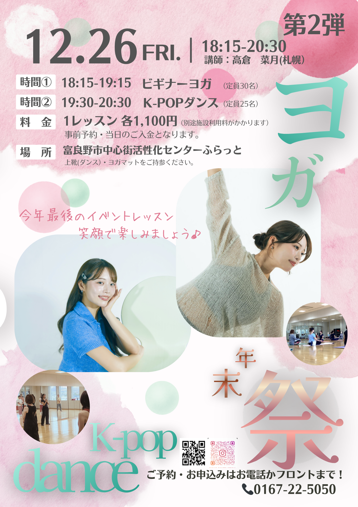 2025年12月13日 / 最終更新日 : 2025年12月13日 staff お知らせ 12月26日(金)ヨガ・K-POPダンスイベントのお知らせ 12月26日(金)①ビギナーヨガ18:15-19:15②K-POPダンス19:30-20:301レッスン各1,100円※別途施設利用料がかかります。 今年最後のイベントレッスンとなります!みなさまお待ちしております😊 事前予約が必要です。フロントもしくは、0167-22-5050までご連絡くださいませ🐛 k-popチラシ3ダウンロード