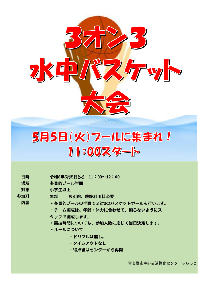 ③「3オン3 水中バスケット大会」ふらっと初開催!なんとプールでバスケット!?