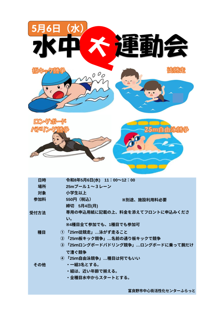種目:25M徒競走、25M板キック競争、25Mロングボードパドリング競争、25M自由泳競争